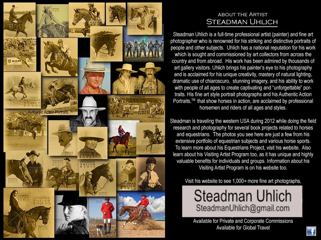 This information card shows a small selection of my work as I was traveling the American West for a few years, living on ranches in several states, learning from Cowboys & Cowgirls, photographing Rodeos, Fox Hunters, Horse Sports, World Champion Horse Trainers and Competitors, and more. I have over 1,000 finished portraits and fine art photos and action photos of those subjects. In the future, t